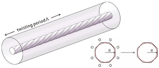 Twisted octagon-shaped core fiber structure. Inset image shows the modification from a P-CCC fiber to a twisted octagon-shaped core fiber (cross section), and the red line is the inscribed circle of the octagonal shape. R is the inscribed circle radius and Λ is the twisting period.