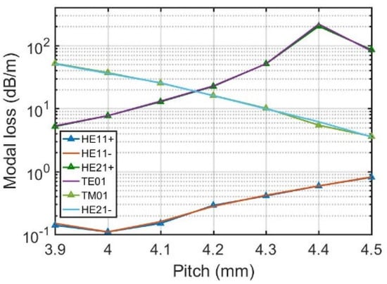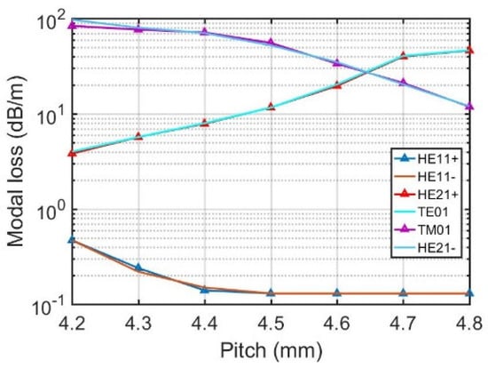 Modal losses of a twisted heptagon-shaped core fiber versus Λ with R = 25 μm, NA = 0.065, and λ = 1064 nm, Λ in the range of 4.2–4.8 mm.