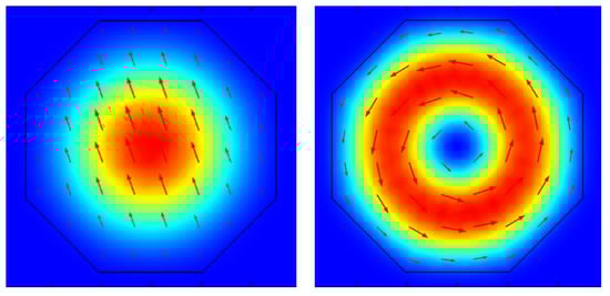 Intensity profiles of HE11 (left) and TE01 (right) modes in an untwisted octagon-shaped core fiber with R = 25 μm, NA = 0.065 and λ = 1064 nm.