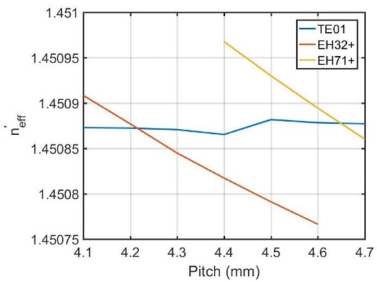 Modal coupling between a guided mode TE01 and leaky modes EH32+ and EH71+ in a twisted octagon-shaped core fiber with R = 25 μm, NA = 0.065, λ = 1064 nm, and Λ in the range of 4.1–4.7 mm.