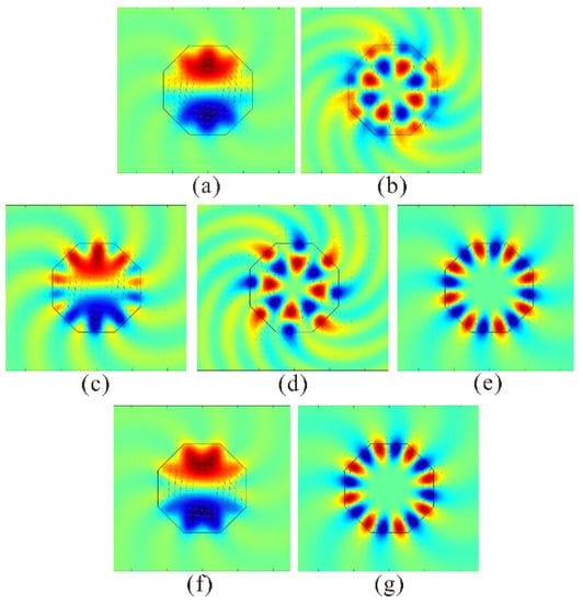 To show the modal coupling caused mode deformation of these modes, x-components (Ex) of electric field distributions of TE01, EH32+, and EH71+ modes of a twisted octagon-shaped core fiber design with R = 25 μm, NA = 0.065, λ = 1064 nm, and Λ = 4.2 mm ((a) TE01, (b) EH32+), 4.4 mm((c) TE01, (d) EH32+, (e) EH71+), 4.6 mm ((f) TE01, (g) EH71+) are shown in Figure 6. It can be seen that there is power of guided mode leaking into cladding, shown in Figure 6a,c,f. The Ex of electric field distribution of TE01 mode around the core and cladding interface changes to EH32+ and EH71+ modes, particularly when Λ = 4.4 mm. This also indicates that the guided mode TE01 couples with leaky modes EH32+ and EH71+. The tail-like profiles, which appear in TE01, EH32+, and EH71+ modes, show that these modes carry angular momentum, and electric fields distributing outside the octagon-shaped core are induced by the losses of these modes.