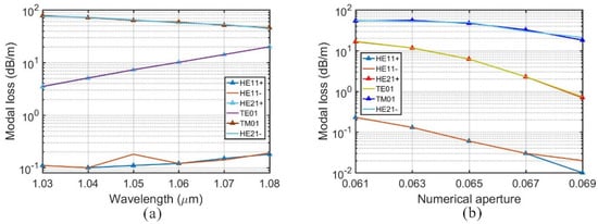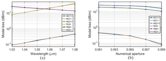 (a) Modal losses of a twisted octagon-shaped core fiber versus wavelength with R = 25 μm, Λ = 4.2 mm, and NA = 0.065, λ in the range of 1.03–1.08 μm. (b) Modal losses of a twisted octagon-shaped core fiber versus NA with R = 25 μm, Λ = 4.2 mm, and λ = 1064 nm, NA in the range of 0.061–0.069.