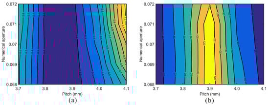In this section, the core diameters of fibers are scaled up to 80 μm for SM operation. SM operation is achieved in a twisted octagon-shaped core fiber with R = 40 μm, NA = 0.07, and Λ = 3.9 mm, and losses of HE11+, HE11−, HE21+, TE01, TM01, and HE21− modes at 1064 nm are 0.14 dB/m, 0.15 dB/m, 19.08 dB/m, 19.34 dB/m, 35.24 dB/m, and 33.65 dB/m, respectively. The FM losses of this fiber with different combinations of NA (in the range of 0.068–0.072) and Λ (in the range of 3.7–4.1 mm) and ratios of the lower one of first HOM losses to fundamental mode losses are shown in Figure 10a and Figure 10b, respectively. In these combinations, the FM losses vary from lower than 0.2 dB/m to 1.2 dB/m, while the loss ratio varies from lower than 20 to higher than 120. In a twisted heptagon-shaped core fiber with R = 40 μm, NA = 0.068, Λ = 3.9 mm, losses of HE11+, HE11−, HE21+, TE01, TM01, and HE21− modes at 1064 nm are 0.14 dB/m, 0.13 dB/m, 17.08 dB/m, 17.49 dB/m, 93.35 dB/m, and 92.33 dB/m, respectively. For the combinations of NA (in the range of 0.066–0.07) and Λ (in the range of 3.7–4.1 mm), FM losses vary from lower than 0.2 dB/m to 2.4 dB/m, and the ratio of the lower one of first HOM losses to FM losses exceeds 160 when NA = 0.066 and Λ = 4 mm, shown in Figure 11a,b, respectively.