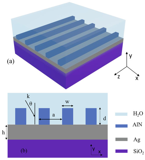 In our device, we choose silicon dioxide as the substrate and silver as the metal layer for its low-loss property in the near-infrared range among all the metals [25]. We pick AlN as the grating material for its transparency in the near-infrared, which can effectively reduce the device loss and lead to a narrower resonance peak. For our simulation, we fix the refractive index of silicon dioxide at 1.45 for its negligible variations. The refractive indices of silver and AlN are from Refs [26,27], respectively. We set water as the surrounding medium for sensor design and fix its refractive index at 1.33. Figure 1b shows the cross-section of the device. The AlN grating with the width, w = 320 nm, is periodically arranged in the x-direction with a period, a = 1070 nm. The thicknesses of the grating, d, and silver film, h, are 440 nm and 100 nm, respectively. The value of the geometric parameter shown in Figure 1b is listed in Table 1.