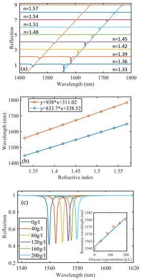 (a) The reflected spectra for different concentrations of the glucose solution. The inset shows resonance wavelength shifts with the glucose solution concentration variation. (b) The resonance wavelengths shift with the glucose solution concentration change-induced surrounding index variation. The linear fitting shows 1264 nm/RIU.