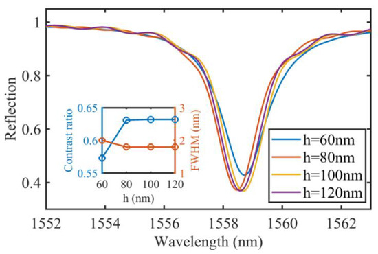 In our device, we choose silver to generate the plasmonic mode. Its thickness plays an important role in the device’s performance. It has been proved that when the metal layer is thinner, parts of the energy are radiated into the substrate, resulting in a larger radiation loss, which gradually stabilizes when the thickness of the metal layer approaches the skin depth of the metal [29]. We calculate the reflected spectra of the quasi-SP-BIC under different silver layer thicknesses in Figure 4. During the calculation, all other parameters are fixed (a = 1070 nm, w = 320 nm, d = 440 nm, = 1.33, = 2°). The thickness of the silver layer could slightly affect the position and the linewidth of the resonance. When the thickness changes from 60 nm to 120 nm with a step of 20 nm, the resonance wavelengths are 1558.64 nm, 1558.42 nm, 1558.56 nm, and 1558.47 nm, and the corresponding FWHM, shown in the inset of Figure 4, are 2 nm, 1.8 nm, 1.8 nm, and 1.8 nm. When the silver layer is thicker than 80 nm, the FWHM becomes stable, indicating no further substrate leakage occurs. In addition, the resonance CR stabilizes when the thickness is greater than 80 nm. Considering the FWHM and the resonance CR, a silver film with a thickness larger than 80 nm is preferred. We thus pick 100 nm as our silver thickness to provide a sufficient buffer for device implementation.