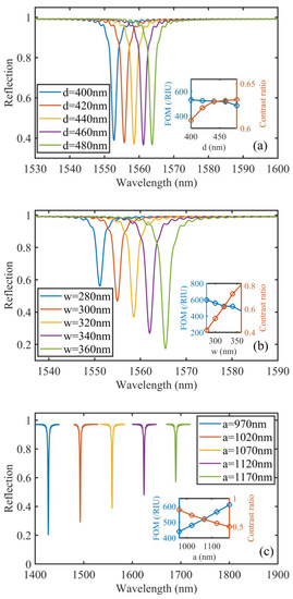 First, we calculate the reflected spectra for different grating heights with fixed grating width (w = 320 nm), period (a = 1070 nm), and incident angle (θ = 2°). Figure 5a shows that when the grating height gradually thickens from 400 nm to 480 nm, the resonance moves to the longer wavelength without significant distortion of its shape. The corresponding FWHM of the resonant peak is around 1.8 nm during the parameter scanning. We also do refractive index sensitivity characterization, showing the sensitivity is within the range of 920 nm/RIU to 960 nm/RIU. Therefore, a thinner grating possesses a higher sensitivity and thus a higher FOM, as shown in the inset of Figure 5a. However, from Figure 5a, we observe a slight decrease in the resonance CR for the grating height is smaller than 440 nm. Considering the overall performance, we pick 440 nm as our grating height to provide a higher FOM without sacrificing the CR of the resonance. This also provides a reference for our future design.