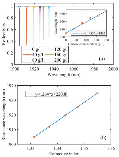 Figure 3c presents the simulated resonance shift corresponding to different glucose concentrations in water with the incident angle at 2°. The refractive index of the glucose solution is taken from Ref. [28]. The resonance red-shifts linearly as the glucose concentration increases, showing 0.1 nm/(g/L).