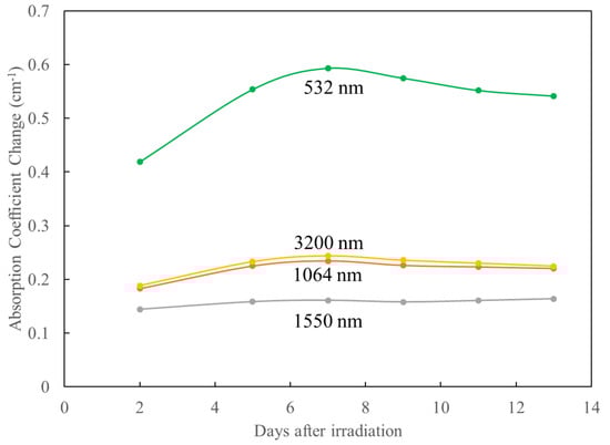 Figure 3 shows the room-temperature dark change in absorption (for sample #3) as a function of days after neutron irradiation for four specific wavelengths (532 nm, 1064 nm, 1550 nm, and 3200 nm). At room temperature, the absorption continuously increased from day 2 to day 7 after irradiation, and then slightly decreased from day 7 to day 9, ending stationary after day 13. The change in absorption after neutron irradiation was more significant for the 532 nm wavelength and was much smaller for the 1064 nm, 1550 nm, and 3200 nm wavelengths. The dark change in absorption was not obvious for 1550 nm.