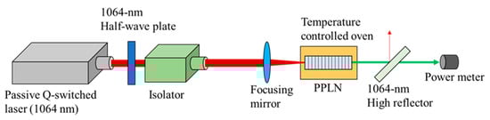 Figure 4. A pulsed laser was used as the fundamental source. It is a 1064 nm passively Q-switched Nd:YAG laser, generating 1-ns pulses with a pulse energy of 9 µJ and a 3.76-kHz repetition rate. The peak power is 9 kW and the average power is 34 mW. An attenuator-isolator set, consisting of a Faraday rotator following a half-wave plate, controls the pump energy and eliminates the optical feedback. The focusing mirror focuses the pump laser beam to the PPLN crystal. The oven, containing the PPLN crystal, maintains the temperature at the SHG phase-matching temperature. The SHG temperature tuning curve acts as a sinc function and can be measured by recording the SHG power while tuning the PPLN temperature. The phase-mismatch caused by neutron irradiation can thus be determined in terms of the changes in the phase-matching temperature.