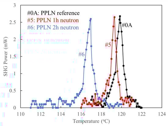 Figure 5 shows the phase-matching temperature tuning curve obtained for the neutron-irradiated PPLN samples. Sample #0A was a reference PPLN crystal without any irradiation. Samples #5 and #6 were irradiated by THOR for 1 h and 2 h, respectively. The gamma-irradiated PPLN crystal (sample #4) had a similar temperature tuning curve as sample #0A and was not shown in