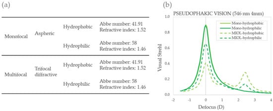 Intraocular lenses. (a) Material and designs characteristics for all IOLs; (b) monochromatic optical quality metric (546 nm) in the form of Visual Strehl (4 mm) for all four IOLs: mono-hydrophobic (solid light green); MIOL-hydrophobic (dashed light green); Mono-hydrophilic (solid dark green); MIOL-hydrophilic (dashed dark green).