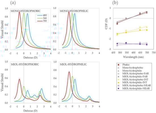 Optical quality metrics were obtained using computational ray tracing for the phakic model eyes in combination with both materials and IOL designs, for blue (480 nm), green (546 nm), and red (700 nm), in the form of TF Visual Strehl curves (Figure 3a). Chromatic difference of focus was obtained from the focus positions of the peaks of the TFVS curves for the different wavelengths and distances, as shown in Figure 3b. Slopes of the CDF curves were very similar for the monofocal implanted eyes for far vision, independently of the material of the lens (Table 2), where slopes differed significantly for near vision. In intermediate vision, slopes were similar, but CDF curves differed in the red light region.