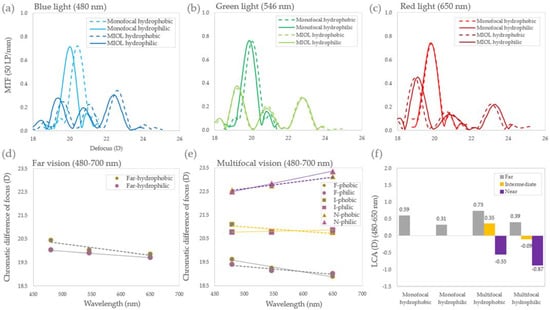 On-bench LCA. (a–c) TF MTF (50 LP/mm) for the monofocal, multifocal, hydrophobic (dashed lines), and hydrophilic (solid lines) for blue (480 nm), green (546 nm), and red (650 nm); (d,e) chromatic difference of focus (CDF) for the monofocal and multifocal IOLs, for far (gray lines), intermediate (yellow lines) and near (purple lines) distances; (f) longitudinal chromatic aberration (LCA) for the 480–650 spectral range for far (gray), intermediate (yellow), and near (purple) distances.