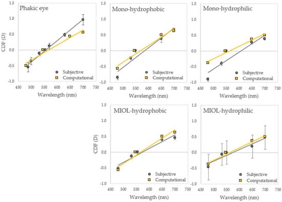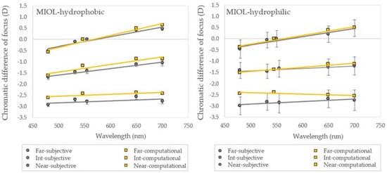 Average chromatic difference of focus (CDF) for multifocal vision. CDF for hydrophobic and hydrophilic MIOLs for far (0 D), intermediate (1.75 D), and near (3.50 D) vision measured with subjective (gray circles) and computational (yellow squares) techniques. Error bars stand for inter-subject variability in all cases.