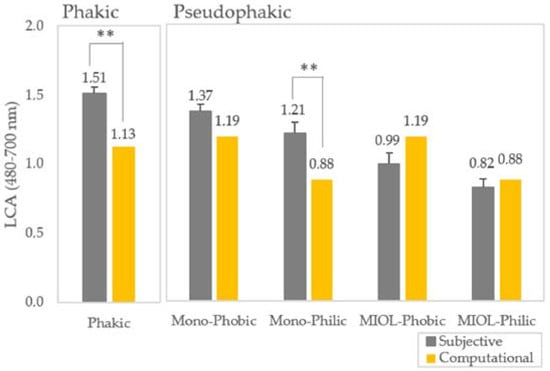 Average LCA (480–700 nm) for far vision for phakic and pseudophakic eyes obtained from subjective (solid gray bars) and computational (solid yellow bars) methods for far vision. ** Highly statistically significant (p < 0.01) differences between conditions. Error bars indicate inter-subject variability.