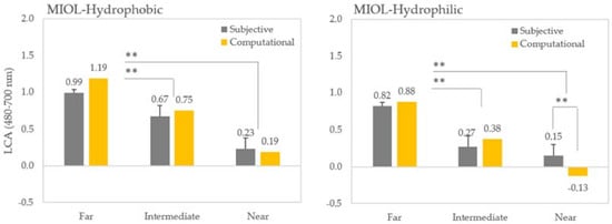 Average LCA (480–700 nm) for multifocal vision for hydrophobic and hydrophilic MIOLs from subjective (solid gray bars) and computational (solid yellow bars) methods for far, intermediate, and near vision. Error bars stand for inter-subject variability in all cases. ** Statistically significant (p < 0.01) differences between conditions. Error bars indicate inter-subject variability.