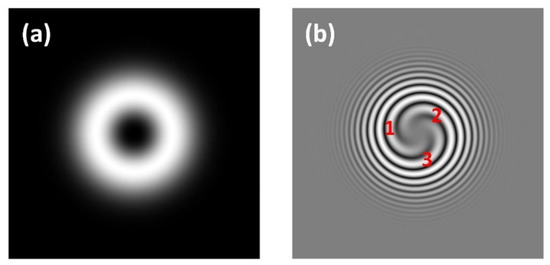 beam is clear and the spiral fringe identifying the vortex could be clearly observed in the interference pattern. When the off-axis displacement value