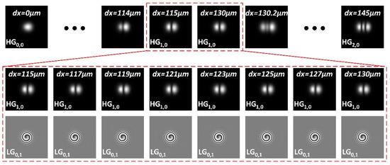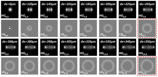 Figure 15 shows three typical HG and LG beams, which are achieved in the experiment with different dual off-axis displacement values