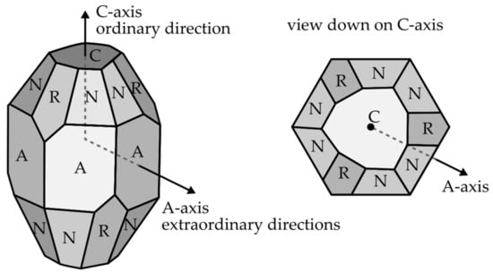 Monocrystalline sapphire is one of the most durable, heat- and wear-resistant materials known to mankind. Moreover, its chemical resistance is unmatched by most alternative optical materials []. Thus, it is popular in various industrial, medical and scientific application fields []. It additionally provides outstanding optical properties in the near-infrared region []. Sapphire is built up from rhomboidal crystals, as indicated in Figure 1.