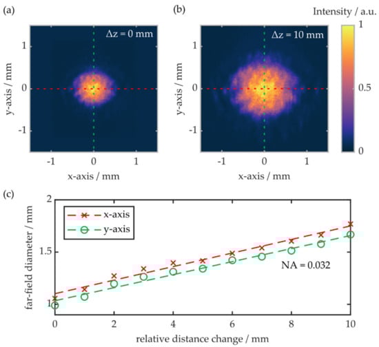 (a) Far-field image at a relative distance change Δz of 0 mm. (b) Far-field image at a relative dis-tance change Δz of 10 mm. (c) Respective far-field diameters in x- and y-direction as a function of the relative distance change.