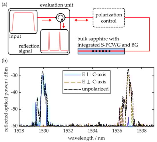 The demonstrated S-PCWGs can additionally be equipped with a Bragg grating structure, i.e., a periodic refractive index modulation along the waveguide axis. Therefore, an additional modification line is fabricated in the center of the depressed waveguide cladding (see Figure 2b) by employing the point-by-point writing method []. For this modification with a length of 5 mm, the pulse energy is kept constant, while laser repetition rate and the translation speed of the substrate are reduced to 500 Hz and 0.44 mm·s−1, respectively. This results in a periodic refractive index modulation with a modification distance, and consequently a Bragg grating period, of 880 nm. The overall manufacturing time of an S-PCWG with integrated BG accumulates to 200 s. Observation of the resulting BG reflection signal is done by means of a commercial-grade interrogation unit (Hyperion si155, Micron Optics), which generates a broadband input signal and evaluates the specific spectral reflection of the photonic structure. The interrogation setup is also equipped with an external polarization control unit. A schematic of the employed evaluation setup as well as the residual Bragg reflection signals for different polarization states are shown in Figure 6.