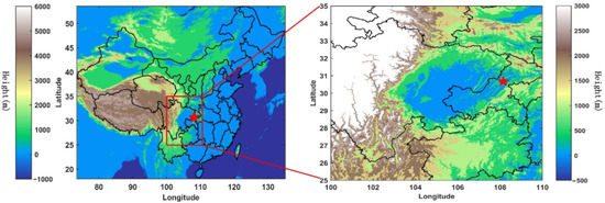 Based on pulsed coherent Doppler lidar (PCDL), microwave radiometer, micro-thermometer, and radiosonde, a field campaign was conducted by the Anhui Institute of Optics and Fine Mechanics, Chinese Academy of Sciences, in 2021, to study the spatiotemporal evolutionary mechanism of optical turbulence in the northeast of the Sichuan Basin. The geographic location of the Sichuan Basin and the field campaign site is shown in Figure 1. The Sichuan Basin has a special geographical location, with the Qinghai–Tibet Plateau in the west and the middle and lower Yangtze plains in the east. In the northeast of the Sichuan Basin, there is a series of northeast–southwest valleys, and the test site was located in one of the wide valleys, where the altitude of the surrounding mountains was between 1500 and 2000 m. This altitude is within the range of the atmospheric boundary layer, which may have an important impact on the development of optical turbulence. With the unique topography and landforms, it will show different meteorological characteristics than other locations.