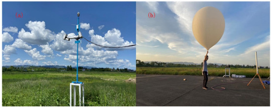 During the campaign, a micro-thermometer, from the Anhui Institute of Optics and Fine Mechanics, Chinese Academy of Sciences, was installed approximately 3 m over the Earth’s surface, and the daily variation in turbulence strength near the ground was obtained [20,21,22,23]. A comprehensive description of the micro-thermometer and its specifications are given in [4,24,25]. The installation location of the instrument and the surrounding environment are shown in Figure 3a. In order to improve the turbulence strength estimation model to make it more suitable for the site, a balloon-borne radiosonde equipped with micro-thermometers and GPS was launched at the experimental site as shown in Figure 3b. The working status and available meteorological parameters provided by each instrument are described in Table 3.