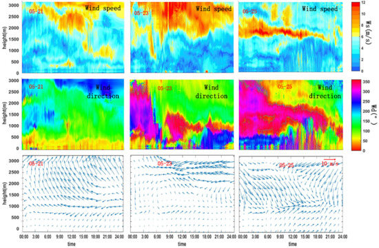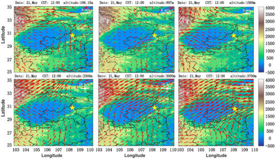 To better explain the vertical distribution of wind speed and direction, Figure 5 shows the corresponding changes at 12:00 on 21 May at different AGL heights (106.15, 897, 1566, 2300, 3000, and 3700 m). The white arrows represent the magnitude and direction of the wind speed and the yellow five-pointed stars the campaign site. In the Sichuan Basin, the wind speed at heights of 106.15 and 897 m was slow, and there was no uniform wind direction. At a height of 1566 m, the wind speed over the basin is still very small, but the wind direction tended to be consistent. In contrast, the wind speed increased, and the wind direction was consistent as the height increased. After the height reached to 3700 m, the wind direction over the entire basin was consistent with the outside of the basin. The spatial difference in wind speed and wind direction could be the result of the terrain, which had good agreement with the results obtained by PCDL. The Sichuan Basin can be regarded as a semi-enclosed space. Inside the space, the wind speed and direction of each location developed independently, so the wind speed was different and showed different wind directions. Outside the space, due to the influence of the westerly zone, the wind speed increased overall, and the wind direction tended to be consistent.