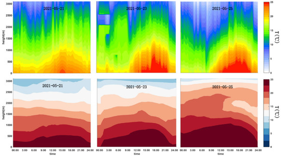 Similarly, the spatiotemporal distribution of the temperature from the microwave radiometer and ERA5 reanalysis data are shown in Figure 6. The temperature had an obvious diurnal variation trend, which reached its maximum between 15:00 and 16:00. Weather had an obvious effect on the vertical distribution of temperature; for example, on 25 May, after a drizzle, there was a heavy rain between 7:00 and 9:00, and then the sun was shining. Compared with the pictures obtained from the microwave radiometer, the ERA5 data did not accurately reflect the real-time changes in the temperature due to the fact of its lower resolution, but they still displayed the same temperature change trends.