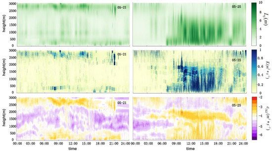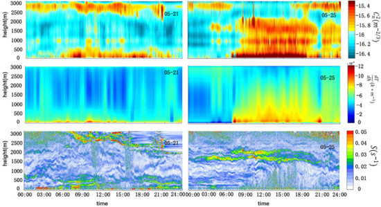 Using basic meteorological parameters from the PCDL and microwave radiometer, the spatiotemporal variation of estimated by the modified HMNSP99 model is illustrated in Figure 8. Both 21 and 25 May were selected to display the spatiotemporal variation in the optical turbulence and corresponding affecting factors. It is noted that in the two figures, the values of were basically above −16.5 m–2/3, and the values seem to be consistent with Masciadri’s studies [34]. In order to investigate the factors affecting the development process of turbulence, Figure 8 also shows the temporal and spatial diurnal variation characteristics of temperature gradient () and wind shear (). It is obvious that the optical turbulence strength and temperature gradient were in good agreement under 2 km, that is, the greater the temperature gradient, the stronger the turbulence strength. Moreover, the strong turbulent layer above 2 km, especially from 2.5 to 3 km, was related more to wind shear, where there was an increase in the influence of wind shear and a decrease in the influence of temperature gradient.