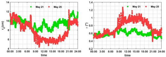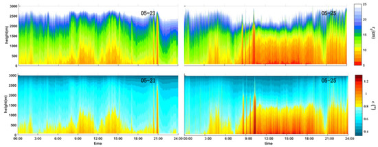Based on the PCDL and microwave radiometer data, the diurnal variation curves of the turbulence strength at different altitudes were obtained, and they are depicted in Figure 9. As can be seen, for turbulence mainly deduced by temperature gradient, its strength gradually decreases with the increase in altitude. The refractive index structure constant had a relatively typical “Sombrero” feature at different altitudes, which gradually disappear with the increase in altitude. Notably, there was a little more disagreement between the two days’ diurnal variation curves of turbulence strength, where the typical “Sombrero” feature disappeared at 704 and 2055 m, respectively. The reason for this was that on 21 May it was cloudy, while on 25 May it was mainly sunny. The development of optical turbulence in the boundary layer is closely related to air temperature. Similarly, the diurnal variation curves of the surface layer, , from the micro-thermometer are clearly illustrated in Figure 9c. Compared with the turbulence strength on 21 May, the strength on 25 May was significantly enhanced, and strong turbulence existed for a longer time. From Figure 6, the air temperature on 21 May was lower than that on 25 May. Only the air temperature near the ground reached 25 °C at 15:00 on 21 May. Compared with 21 May, the high temperature lasted longer on 25 May, and the maximum height reached 0.5 km. Differences in the air temperature resulted in the strength of the optical turbulence and limited the maximum height of turbulence development.