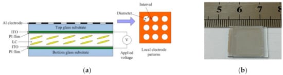 LC-MLA was designed considering both the elastic continuum theory and the gradient refractive index lens theory. It contains two indium tin oxide (ITO) substrates with a 20 μm thickness of spacers. The aluminum (Al) film electrode was fabricated on the top substrate, which has 128 × 128 hole patterns. The specific diameter of a single hole pattern is 160 μm, and the adjacent interval between the two elements is 30 μm. Nematic LC, a commercial product E44 of Merck Co. (Kenilworth, NJ, USA), was poured into the empty LC-cell by capillary, and the AB glue was used to seal the LC-cell. The driving electric field between the top Al-electrode and the bottom substrate adopts a tunable square wave from 0 Vrms to 20 Vrms under 1KHz frequency. The alignment direction of the LC director was along the horizontal direction by the rubbing polyimide (PI) method. The schematic structure of LC-MLA is as shown in Figure 2.