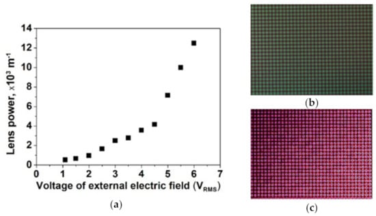 To demonstrate the classic electro-optical performance of the proposed LC-MLA, we used a commercial CCD MV-SUA500C-T (Shenzhen Mind-Vision Technology Co., Ltd., Shenzhen, China), which collects 2D images to a PC. In the following experiments, a laser with a wavelength of 633 nm was used as a light source. The rubbing direction of the LC-MLA is 45° concerning for one of the polarizers. As shown in Figure 3a, its focal length point was recorded and converted into the lens powers, defined as the inverse focal length. The applied voltage-dependent lens power of the LC-MLA is shown in Figure 3a. The lens power shows from 0.556 × 103 m−1 to 13.7 × 103 m−1 as 0 Vrms < V < 6 Vrms.