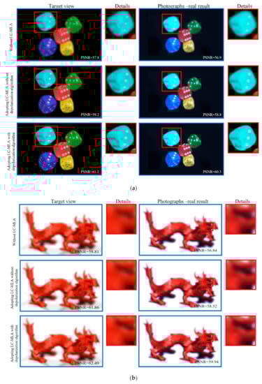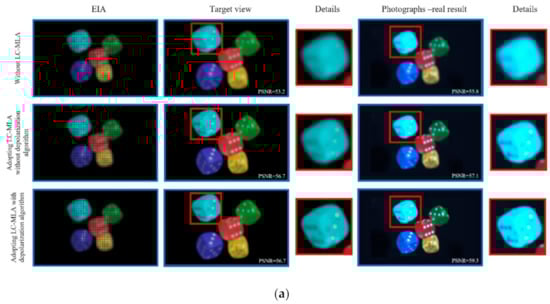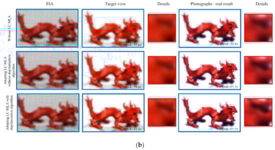 The comparative results of the light field display on the smartphone are shown in Figure 5. Peak signal to noise ratio (PSNR) is employed to qualify the light field display views. We adopted three control group experiments to compare the effect of using LC-MLA with the depolarization algorithm. These experiments were as follows. The first group adopted the regular glass type MLA without LC-MLA (glass MLA-type 150-5C from Thorlabs Co). The second group adopted LC-MLA without depolarization algorithm (the applied voltage at 2 Vrms) []. The third group adopted LC-MLA with a depolarization algorithm (the lens state is the applied voltage at 2 Vrms, the non-lens state is without applied voltage). Figure 5a gives the “Dices” with 1920 × 1080 pixels. After adopting LC-MLA with the depolarization algorithm, we can see that the image quality of photographs-real results improved from 55.8 dB to 59.3 dB by 1.06 times. The edge detail of “Dices” becomes clear. The image quality of photographs-real results changed from 57.61 dB to 59.81 dB because the depolarization algorithm is a post-processing method that utilizes several image filters, such as a bilateral filter. Therefore, the image quality has an improvement to a certain extent. Figure 5b is the “Dragon.” The PSNR of photographs-real results was improved from 55.81 dB to 57.71 dB by 1.03 times. The inner contour of “Dragon” has arisen, while the inner of the primary effect has detailed information. The improvement is that, after adopting the depolarization algorithm, the refractive index experienced by the o-wave remains unchanged with the angle between the incident ray and the director of LC. The LC-MLA did not tune the o-wave. Namely, only the LC-MLA adjusted the e-wave part of the incident ray. The lens state of LC-MLA changed only e-wave but not o-wave. With the use of the proposed depolarization algorithm, the polarization effect of LC-MLA, a challenge for LC devices, was greatly removed compared to the other control group with LC-MLA. Therefore, the high-resolution intermediate 3D image result was received on the display panels of the smartphone in video mode.