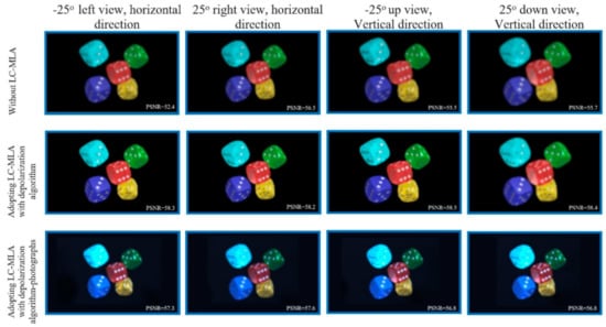 The different views along the horizontal and vertical directions are provided by using CCD to present the performance of the proposed light field display system. The experimental result about −25° left view and horizontal direction indicates that PSNRs of perceived 3D images, −25° left view along a horizontal direction, are noticeably improved from 52.4 dB to 58.3 dB by 1.11 times, as shown in Figure 7. Details of results obtained by the proposed method are mostly expressed in enlarged areas. Although some artifacts appear on edge in the results, the performance of the proposed method is still much more acceptable, especially compared to the other light field display methods without adopting LC-MLA or PDLC film. The “Dices” views are presented in Figure 7, which have full-color and full-parallax for light field display. The strategy of adopting PDLC film is beneficial for expanding the FOV, where most of the incident ray with a large viewing angle is present [].