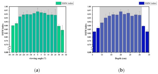 Structural similarity (SSIM) is an index to measure the similarity of two images. In general, this index is used to evaluate image quality. Nowadays, it is also introduced in light field display to assess the image quality of the photograph-real result []. This index is also a complete reference parameter. That means the computation of SSIM needs a reference image. In this study, the reference image for this experiment is chosen as the target view in Figure 7. Figure 8a shows the SSIM values at different viewing angles for the “Dices” in Figure 7. According to the parameters in the proposed system, the computed SSIM values at [−25°,25°] are much higher than other areas, which indicates that the proposed approach has a broader FOV compared to other conventional methods [].