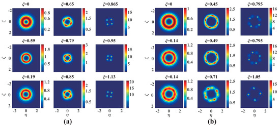 For a Kerr–ROLP medium (V0 ≠ 0, W0 = 0) with symmetry distributions of refractive index with different modulation factors and modulation depths, the evolution of the intensity distributions in the cross-section of the vortex beam with the different vortex topological charge numbers, n = 1 and 2, are shown in Figure 2a,b, respectively. As the propagation distance increased, the ring-shaped vortex beams with different radii gradually split into several focus points within certain propagation distances as shown in Figure 2. For the case of n = 1, four focus points were found at the periphery ring of the vortex beam and finally collapsed into four points when d = 0.23 and 0.31, respectively, as shown in the upper two rows of Figure 2a. For the case of n = 2, the beam was initially split into eight focal points with different intensities and finally collapsed into four collapse points as shown in Figure 2b. As well known, the beams will perform self-focusing behavior during propagation in a nonlinear Kerr medium. However, the energy cannot be accumulated in the vortex beam center, since there is an optical singularity in the center of the vortex optical field; thus, the vortex optical field will autofocus into a light ring. Eventually, the optical field evolves into even number of foci due to the modulation of the optical lattices as shown in Figure 2. The number of the partial collapses depends on the initial powers [15,16,17,37], and the number of partial collapses will increase with the increasing initial powers. For the cases of modulation factors d = 0.23 and 0.31, the location of the final beam collapse was different as shown in the upper two rows of Figure 2. The vortex optical field will initially form some focal points, positions of which are greatly influenced by the refractive index distribution of the real optical lattice (compare Figure 1b and Figure 2). The relative positions of high refraction index in the autofocusing light ring depend on the vortex topological charge number and the modulation factor d. The positions of the foci in the autofocusing light ring with d = 0.23 and n = 1 are different to that of d = 0.23 and n = 2, as shown in Figure 2. In particular, due to the existence of the vortex, these focal points and the optical field will rotate during propagation.