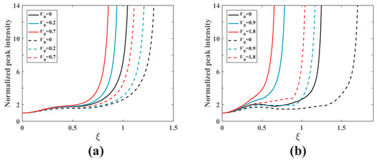 The peak intensity of vortex beams is shown in Figure 3, which is a function of the transmission length. It should be noted here that the increase in the value of V0 will lead to a decrease in the critical power (see Equation (4)). In order to analyze the impact of the modulation depth V0 on the propagation distance for collapse, the same initial powers should be taken for the comparisons. When n = 1 and V0 = 0.2, the initial power Pin = 1.7Pcr = 6.46PG, and if n = 1 and V0 = 0.7, then Pin = 1.7Pcr = 5.61PG. For the case n = 2 and V0 = 0.9, the initial power Pin = 1.4Pcr = 9.52PG, and if n = 2 and V0 = 1.8, the initial Pin = 1.4Pcr = 7.83PG. It can be seen from Figure 3 that the distance required for the beam collapse decreased as V0 increased. This is because with the increase in the value of V0, the modulation effect of the refractive index gradient of the optical lattice was enhanced, leading to the higher optical intensity at the focus point and vice versa. Therefore, the number of focus points, the transmission length of the collapsed vortex beams, and the locations of the collapse were closely related to the refractive index distribution of the optical lattice. In addition, the propagation distances required for collapse decrease with increasing initial powers. When the input power Pin = 6.46PG, the distance required for the collapse of the vortex beam of n = 1 was shorter than ξ = 1, but when Pin = 5.61PG, the collapse distance was longer than ξ = 1 (see Figure 3a). Similarly, the collapse distances of the vortex beam with Pin = 9.52PG were shorter than that of Pin = 7.83PG if n = 2 (see Figure 3b).
