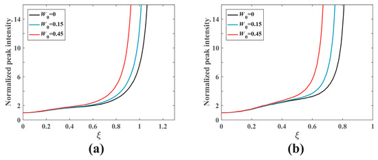 The normalized peak intensity of vortex beams with V0 = 1 and Pin = 1.4Pcr as a function of the propagation distance for different modulation depths of gain–loss W0 in the Kerr–SCPT and Kerr–ROLP media (W0 = 0). The plots (a) and (b) correspond to n = 1 and 2, respectively.