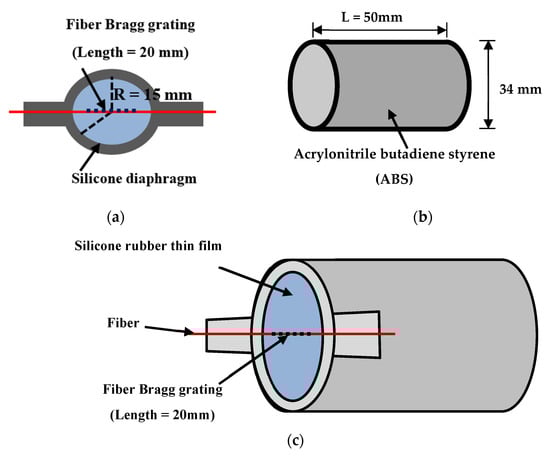 The fiber sensing head is composed of a silicone rubber thin film inserted with an FBG, an acrylic ring, and a hollow cylinder, as shown in