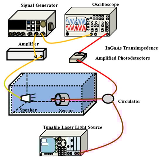 The experimental setup to measure low-frequency acoustic waves by using the FBG hydrophane includes a signal generator, a power amplifier, a loudspeaker, an FBG hydrophone, a rectangular water tank (2 × 1 × 1 m), an optical circulator, a tunable laser, a photodetector, and an oscilloscope, as shown in
