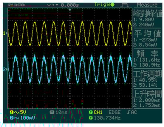 Figure 4. From this figure, we can see that the signals in the two channels have the same frequency of 130.73 Hz. Moreover, by means of changing the frequency or amplitude of the signal generator, we can also see that the two channel signals in the oscilloscope are simultaneously varied but with a slight phase shift.