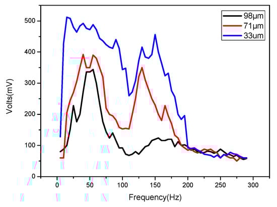 Figure 5. From this figure, the fiber diameter of 33 μm has the best sensitivity, showing that the thinner the fiber diameter, the better the sensitivity and response. Acoustic signals above the frequency of 200 Hz cannot be detected, as the acoustic wave power in the frequency above 200 Hz becomes very small and difficult to measure with this FBG hydrophone, as shown in