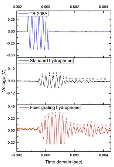 Figure 8, the top blue signal is the original output signal from the generator to be output to drive the transducer (TR-208A), the middle black signal is the acoustic wave measured by the standard hydrophone (8103, B&K), and the bottom signal is the acoustic wave detected by the FBG hydrophone. From the comparison of these experimental results, we can see that the proposed FBG hydrophone has better sensitivity than that of the standard piezoelectric hydrophone. For detecting the original acoustic wave of 6 pulses, there are 20 pulses to be measured by the two hydrophones. This is because the echo caused by the acoustic wave is reflected back to the hydrophone.