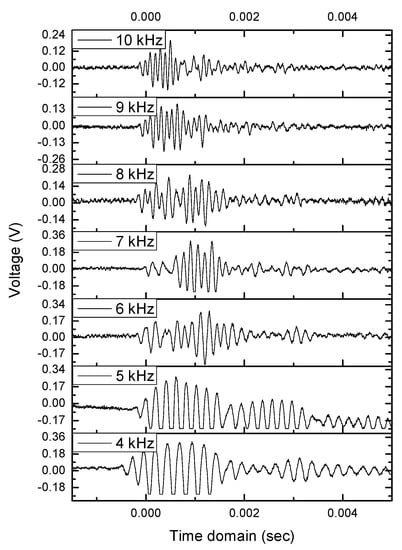 A frequency transducer (TR-208A) is used to generate the acoustic wave with the frequency of 4 kHz and 6 pulses per signal package. From