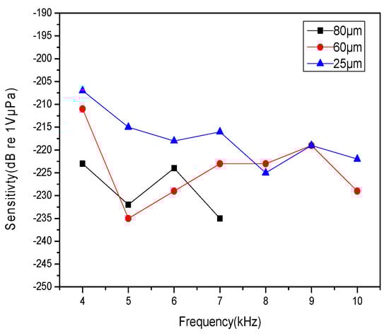 Figure 10 shows the sensitivity curves of the FBG hydrophone versus the frequency of acoustic waves with three different fiber diameters of 80, 60, and 25 μm. From this figure, we can observe that the FBG hydrophone of 25 μm has the highest sensitivity, because the smaller the fiber diameter, the easier the fiber bending. The experimental results reveal that the FBG hydrophone has a suitable performance to measure acoustic signals under water. Although the frequency response of the FBG hydrophone is not wide-band in comparison with the other types of hydrophones, the sensing head can be redesigned to improve the performance in the future.