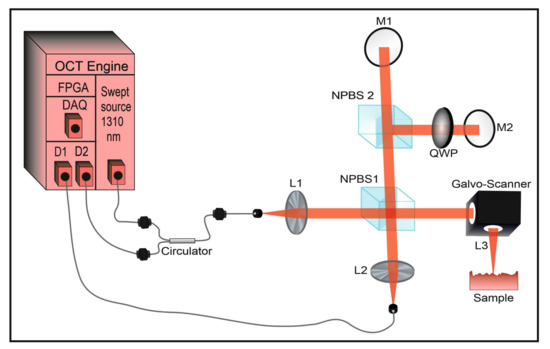 The schematic of the system is shown in Figure 1. The CP-OCT system was built using a swept-source OCT engine (Axsun Technologies, North Billerica, MA, USA). The laser had a sweeping rate of 100 kHz, central wavelength of 1310 nm, scan range of 140 nm and output power of 24 mW. The light from the laser was coupled to a broadband circulator (Thorlabs, CIR-1310-50-APC, Newton, NJ, USA) and was collimated using a lens (L1). The collimated beam of light was split into two parts using a non-polarizing (50/50) beam splitter (Thorlabs, BS012, Newton, NJ, USA) NPBS1. One part of the light beam was used as the reference signal and another part of the beam was directed toward the sample. The light in the reference arm was further divided into two parts using a non-polarizing (50/50) beam splitter (Thorlabs, BS012, Newton, NJ, USA) NPBS2. The transmitted part of the reference beam after the NPBS2 was reflected using a mirror M1. This part of the reference signal had the same polarization as the signal after the lens L1. The reflected part of the beam after the NPBS2 was reflected using the mirror M2 making a double pass through an achromatic quarter-wave plate (Thorlabs, AQWP10M-1600, Newton, NJ, USA). The quarter-wave plate was oriented in a way that it changed the polarization of the light from the mirror M2, orthogonal to the light reflected from mirror M1. Combined light reflected from mirror M1 and M2 made the reference signals. In the sample arm side after the NPBS1, the light was focused using a 25 mm focal length lens L3. The intensity of the light measured on the sample was 9 mW. The light was scanned on the sample using a Galvo-scanner (Thorlabs, GVS012, Newton, NJ, USA). The light was reflected from the reference mirrors M1 and M2, and the sample was interfered at the NBPS1. The interfered signals split into two parts at the NBPS1. One part after passing through the circulator’s third arm was detected using detector D1. The second part was coupled to a fiber using a lens (L2) and detected using a detector D2. The signals from the detectors D1 and D2 were fed to a balanced detector which allowed to remove the common mode noise of the system [31]. The signal from the balanced detector was digitized using a 12 bit, 500 MS/s digitizer. A Hamming window was applied over the digitized signal from the digitizer before performing Fourier transform which resulted in the axial scan of the sample. 2500 axial scans were collected together to make a B-scan of the sample and transferred to the host computer as JPEG images. A LabVIEW-based software was developed to collect the images from the OCT engine and save them to the computer disk.