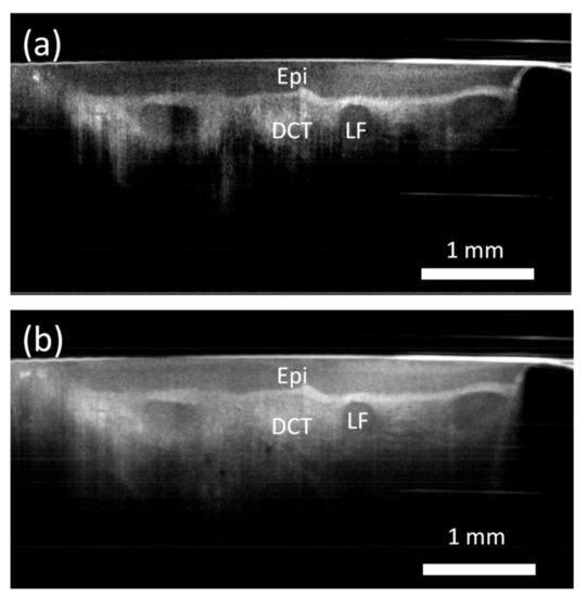 (a) Cross-sectional cross-polarized image of the tonsil tissue. (b) Cross-sectional co-polarized image of tonsil tissue at the same location as the top image. Different features such as the reticulated crypt epithelium (Epi), dense connective tissue (DCT), and lymphoid follicles (LF) can be visualized.