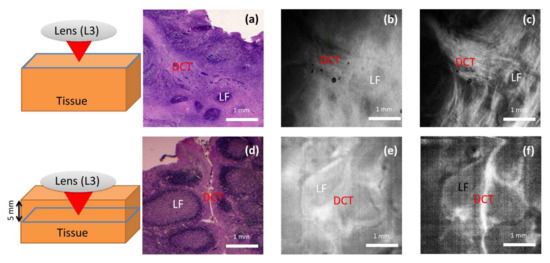 Furthermore, en face images of the tonsil were acquired by cutting the tonsil tissue at two different locations. In Figure 3 top row, images just below the top surface of the tonsil are shown whereas in the bottom row, the images of the tonsil cut approximately 5 mm below the top surface are shown. In Figure 3a, H&E-stained image of the tonsil is shown. Areas with DCT and LF can be seen in the H&E-stained image. In Figure 3b, an en face image generated from the co-polarized image of the tonsil is shown. It can be seen that the DCT shows up poorly in the intensity image. In Figure 3c, the cross-polarized image of the tonsil tissue is shown and one can immediately appreciate the enhanced contrast of the DCT in the cross-polarized image. A similar improvement in the DCT contrast is seen in the images of the tissue cut 5 mm below the crypt surface of the tonsil.